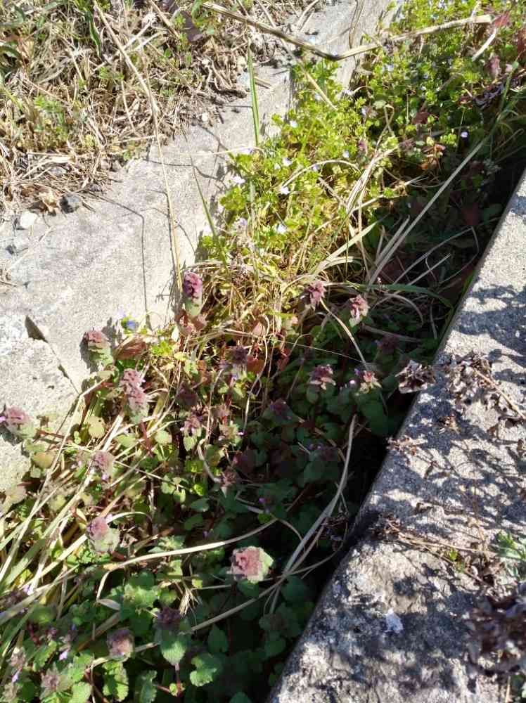 側溝の中 ヒメオドリコソウが咲き始めています💞