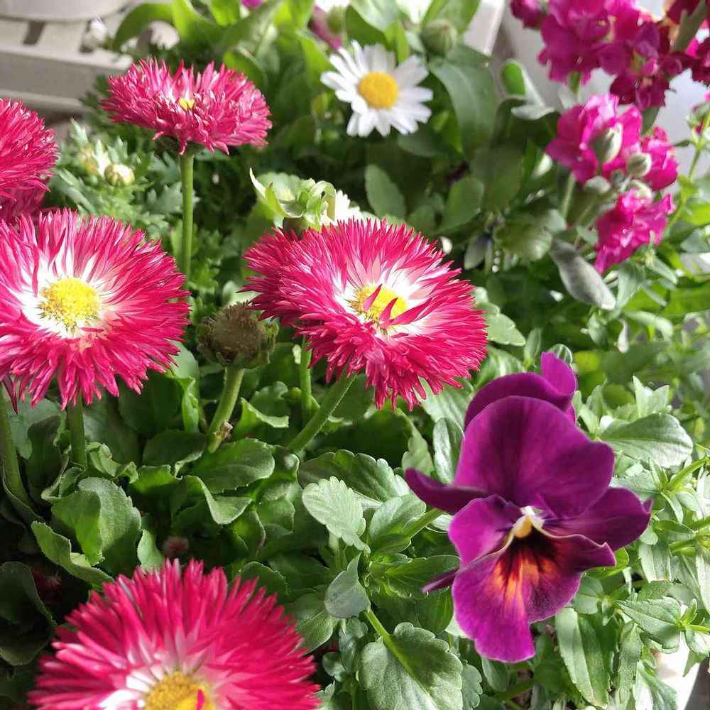 もしかしたら、仕入れたお花が少しずつ残り、お店に新しいお花屋を並べる為、寄せ植えの一鉢に色々と詰め込んで売ってくれたのかもしれないなぁ...😉