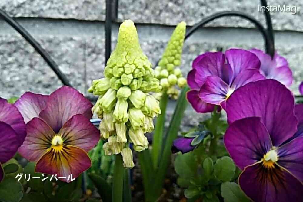 ビオラの間に植えていたムスカリがようやく咲いてきました