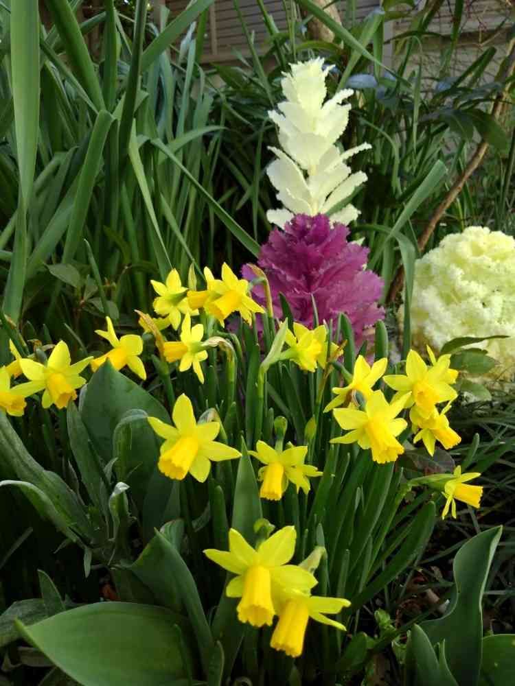 こちらは、咲き始めたミニ水仙とそろそろ終わりかけの葉ボタンです。