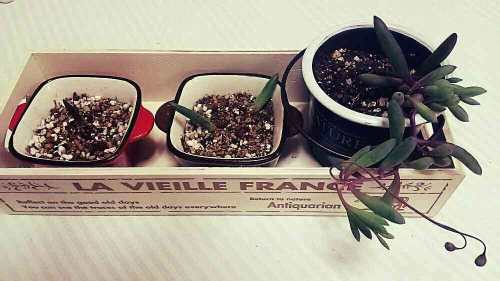 購入した鉢に落ちた葉から根が張っていたのでそれぞれに分けて植え替えました。
