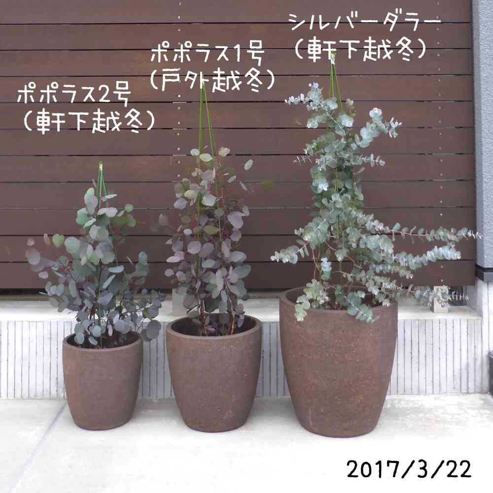 軒下スペースに全部は入らなくて、ポポラス1号は雪をかぶったりしたので葉色が一番悪いです。