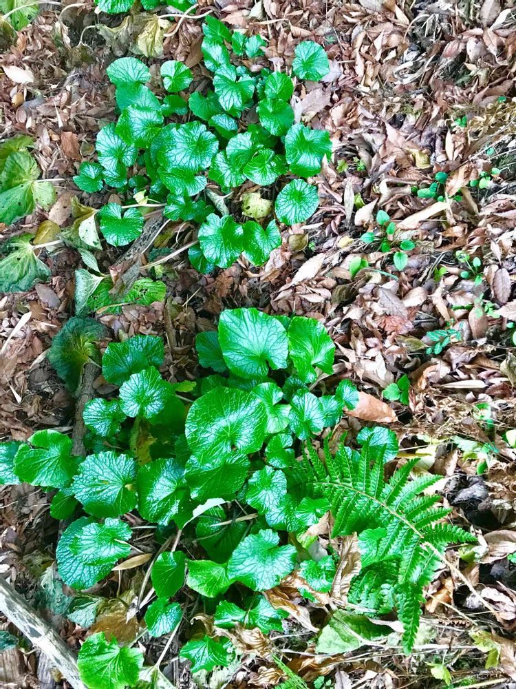 落ち葉のお布団に包まれて、蔵の横の日陰に育っています。