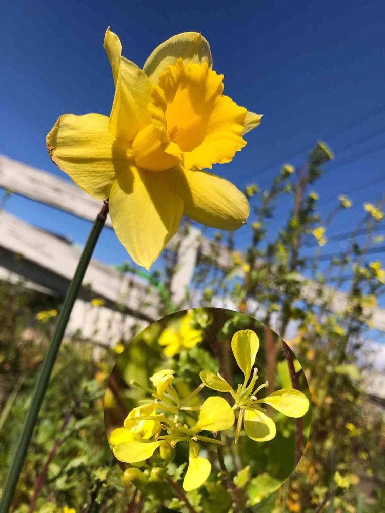 右の小さい黄色は 水分と栄養不足の 菜の花🌼(円内)
