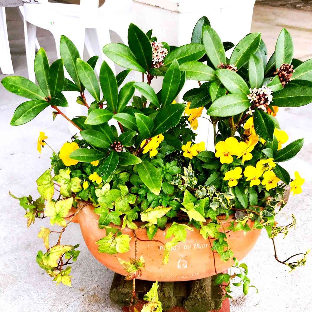 シックな寄せ植えですね。黄色で統一され 全体にバランス感が好きです。