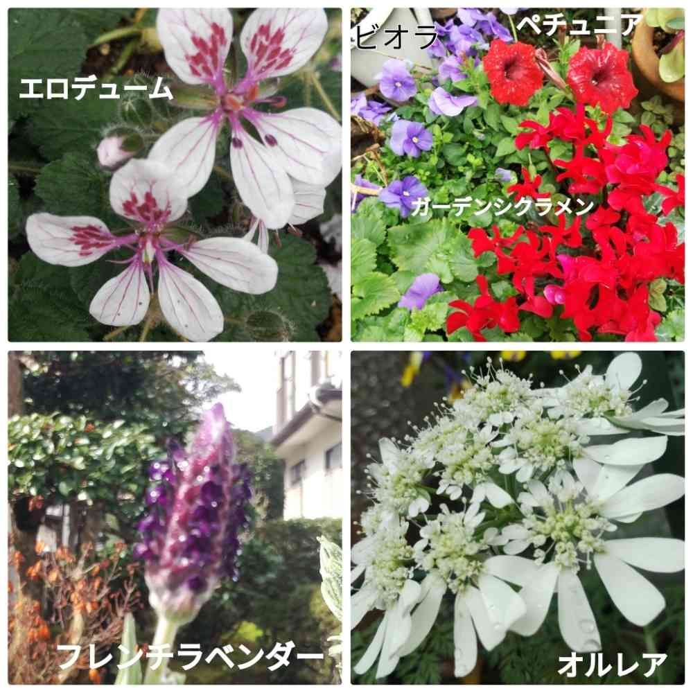 ビオラ、ペチュニアは雨に濡れて光ってます。