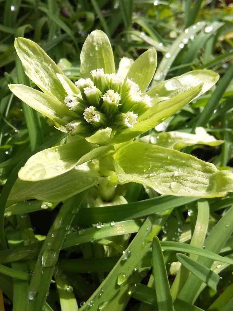 フキノトウがハナニラの葉に囲まれながらも、茎を伸ばし花を咲かせました。