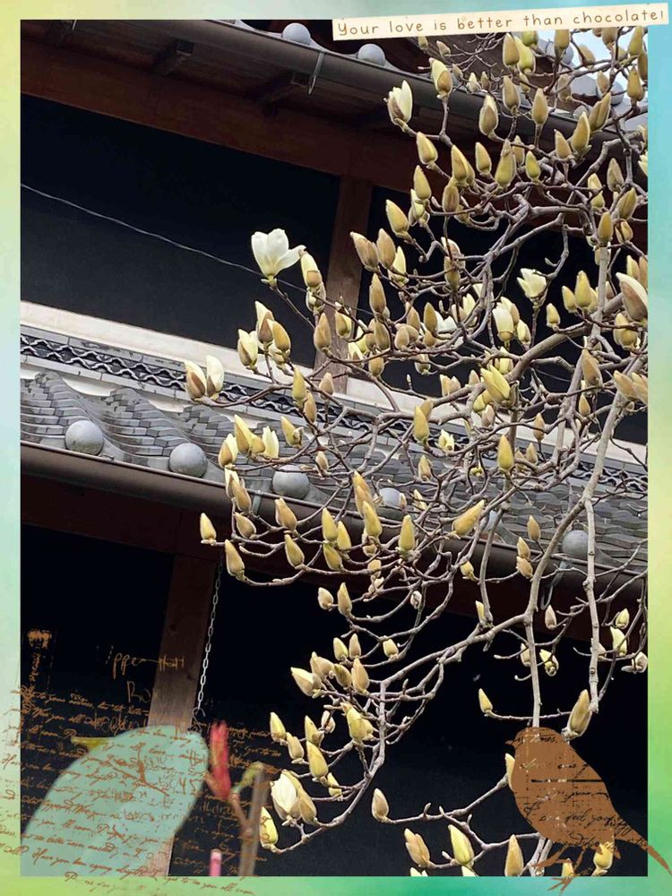 お隣さんの木蓮かなぁ❓暖かくて蕾もほころんできています😊