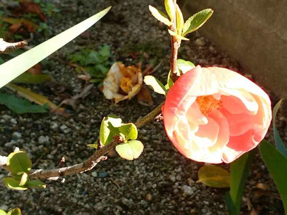 地植えしたボケの花開いてます、ボケは日当たり良いところによく開くみたいだ
