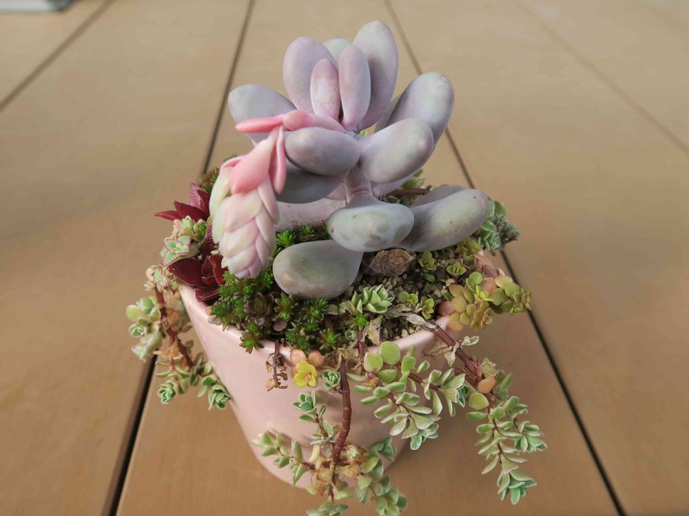 寄せ植えにした11月の時より月美人の花芽やセダムがずいぶん伸びてきました❤