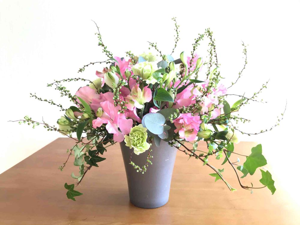 前回投稿したアレンジメントのその後です。レッスンでは時間が足りなそうで、途中でやめたユキヤナギとアイビーを追加しました。基本のドーム型を作ってからちょっと飛び出たりふんわりしたラインを入れても良い、との事で…