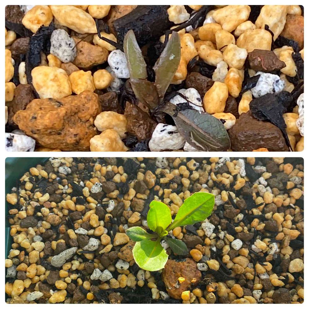 物凄く小さかったですが、毎日成長が見てとれます。コラージュにしたから拡大率が違うのですが小さい黄色の粒が鹿沼土の小粒です。