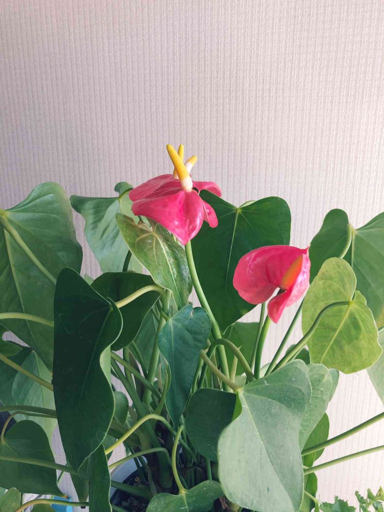 職場のアンスリウム🌸1年前購入🌴葉っぱがモサモサ増えてきたからと花屋さんに相談したら、それでいいんだよ〜って。こんなんだけど…いいのかな…笑