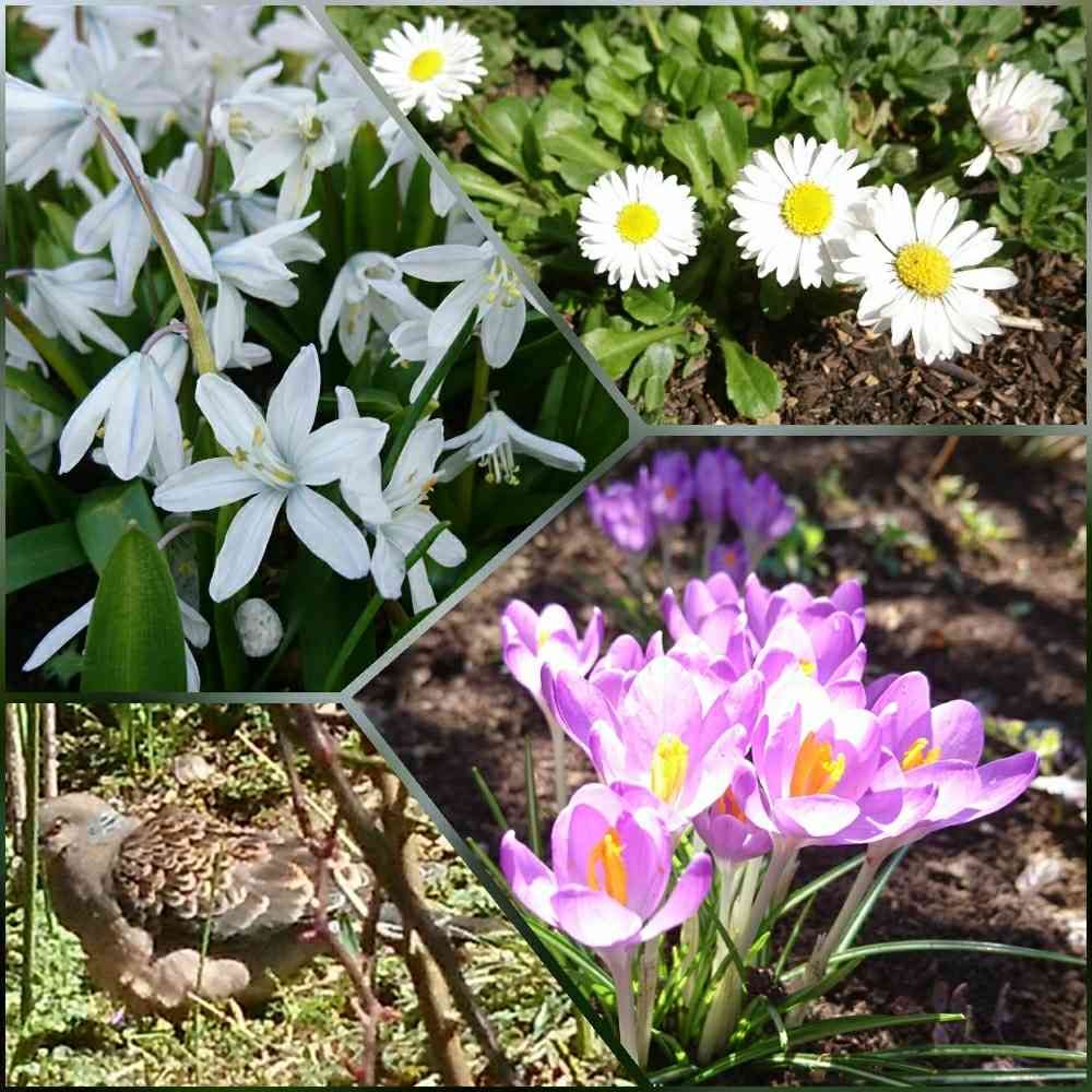 植えっぱなしのクロッカス、プシュキニア、そしてこぼれ種からイングリッシュデージー 🌼