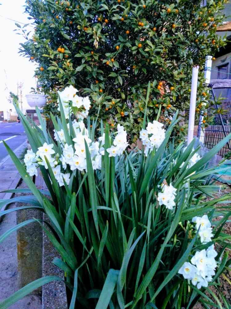お出かけ先,散策の通り道,金柑と白い水仙の投稿画像