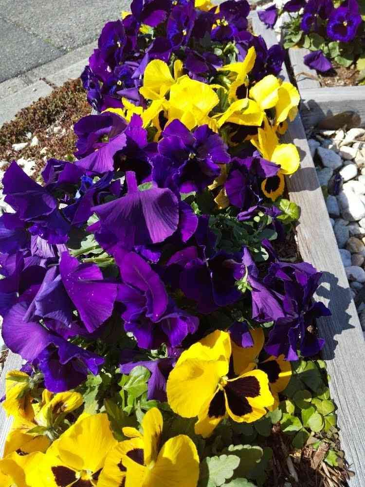 暖かな日差しを浴びて紫💜と黄色💛のパンジーが鮮やかに(*˘︶˘*).。.:*♡✨🔹💛💜スマイル…🤗🎀🧡💟🐾🌱😉💝