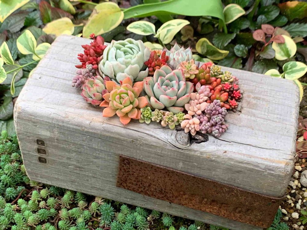 woodさんのカッコいい木箱にまだまだキレイに紅葉した多肉ちゃんがいっぱい😊セダムもキレイな色ですご〜〜くかわいいです❣️