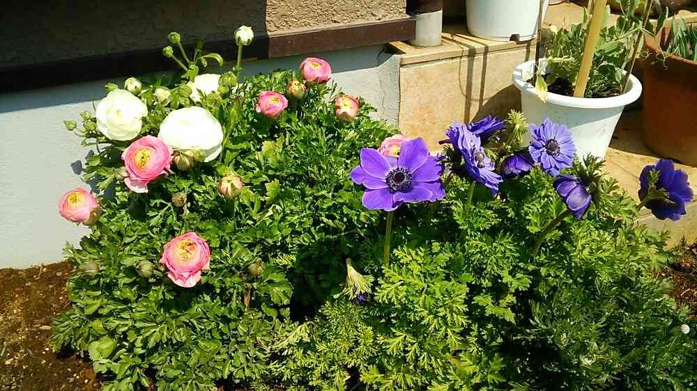 ダイソーの球根から二年目のアネモネ…他にも色があったはずですが紫だけ!!でも何度も上がってきます。切り花に使ってます。ラナンキュラスはこんなに大株になり蕾が沢山♪嬉しい~