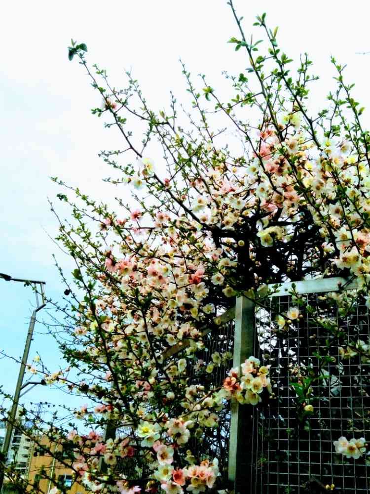 マンションの敷地内、フェンスを乗り越えて、木瓜の花が咲いていました。