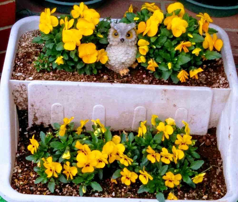 散策の通り道に有るお宅の、2階建てのプランターに、お花の真ん中に🦉