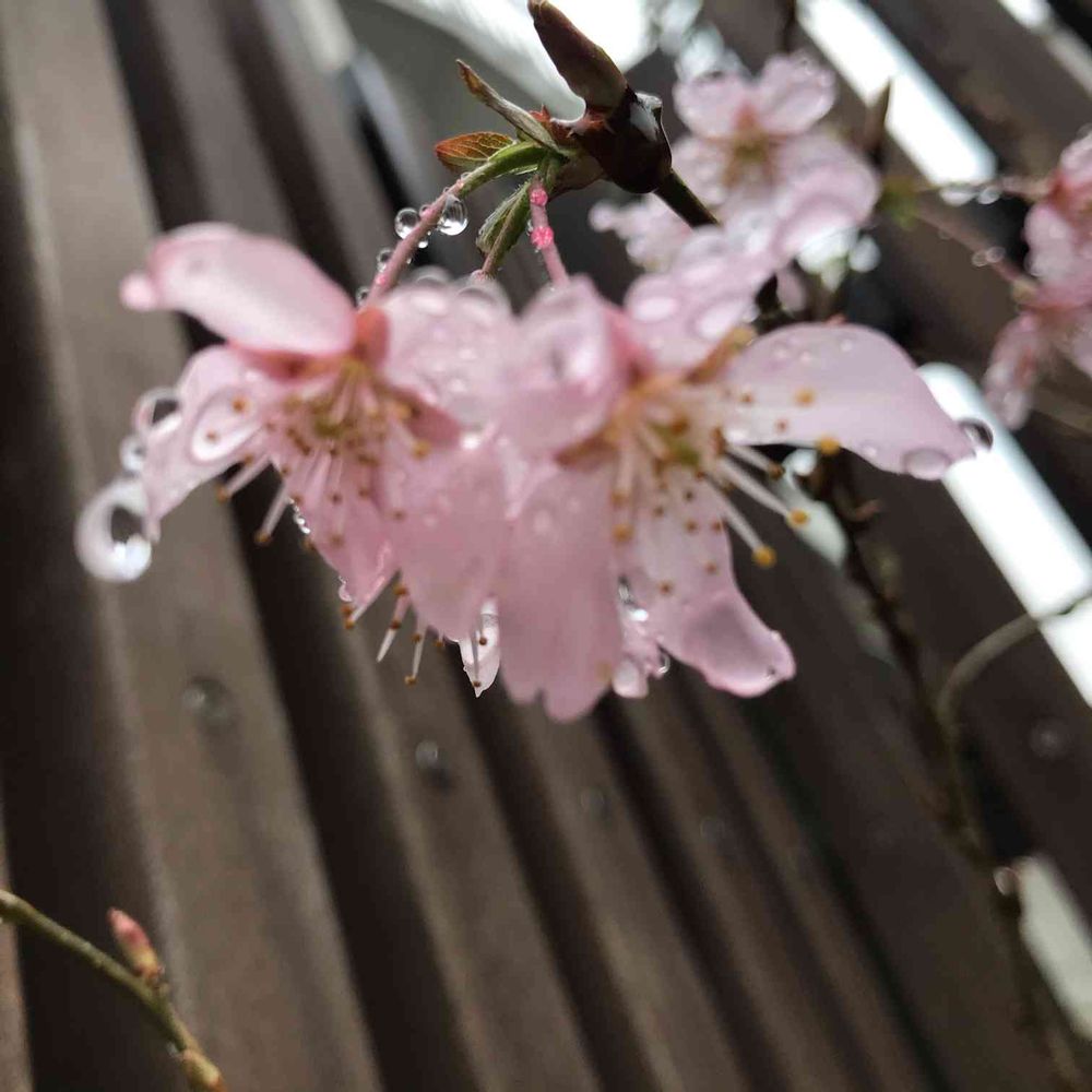 先日の雨の雨に通勤路のお宅の玄関に咲いていた桜です。