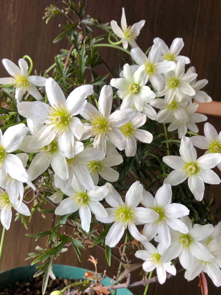 春咲きのクレマチスらしいです。一月末に花芽を発見して屋内に入れたのですけど、そのまま置いても良かったかな?うまく咲いてくれたのでうれしかった🥰