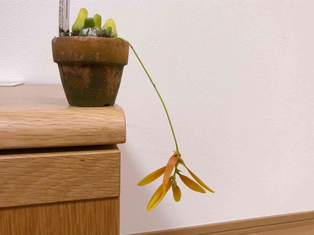 枯れた葉っぱの様な、プロペラの様な、ヘンな花を咲かせるバルボフィラム カンブリエンセ。ずいぶん昔に東京ドームから連れてきた洋蘭の原種です。