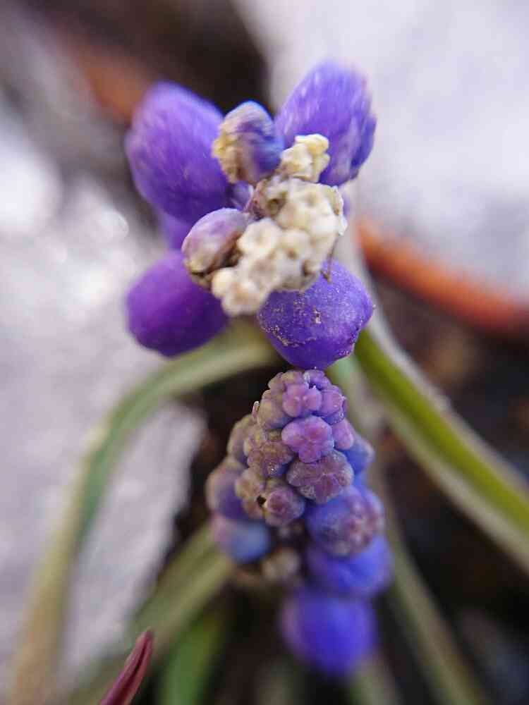 雪どけのヒヤシンスを撮影していた足元に、縮れたちっちゃなムスカリが咲いていた