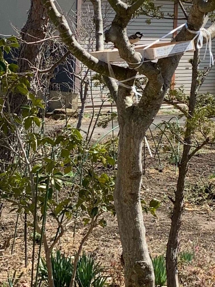 居間から見えるもみじ🍁の木に餌箱をくくり付けて餌付けしてます。