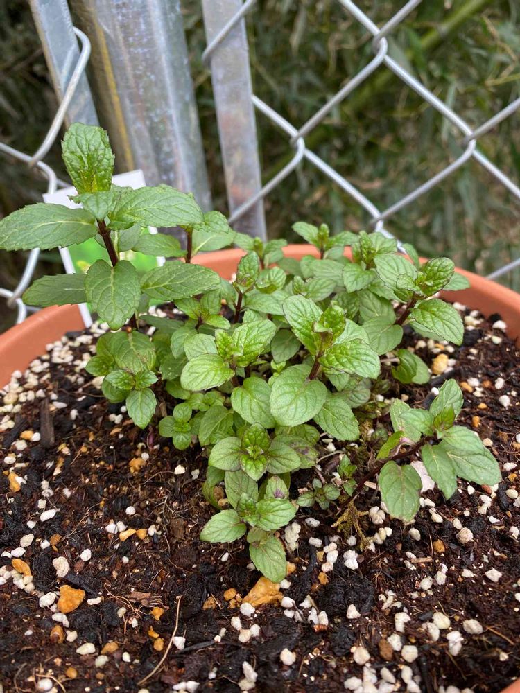 ミントはすごく増えると聞いて、どんなふうになるか気になって、まずは植木鉢に植えてみました。何ミントかな。