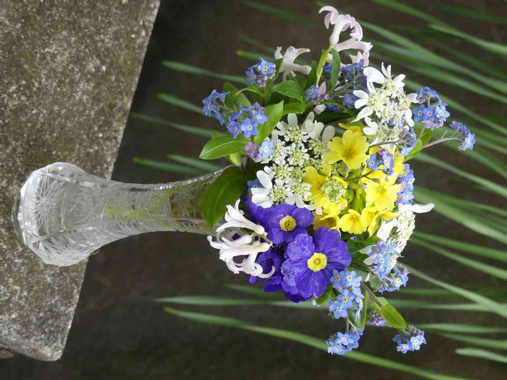 庭の花を摘み、部屋に飾る前に玄関前で!