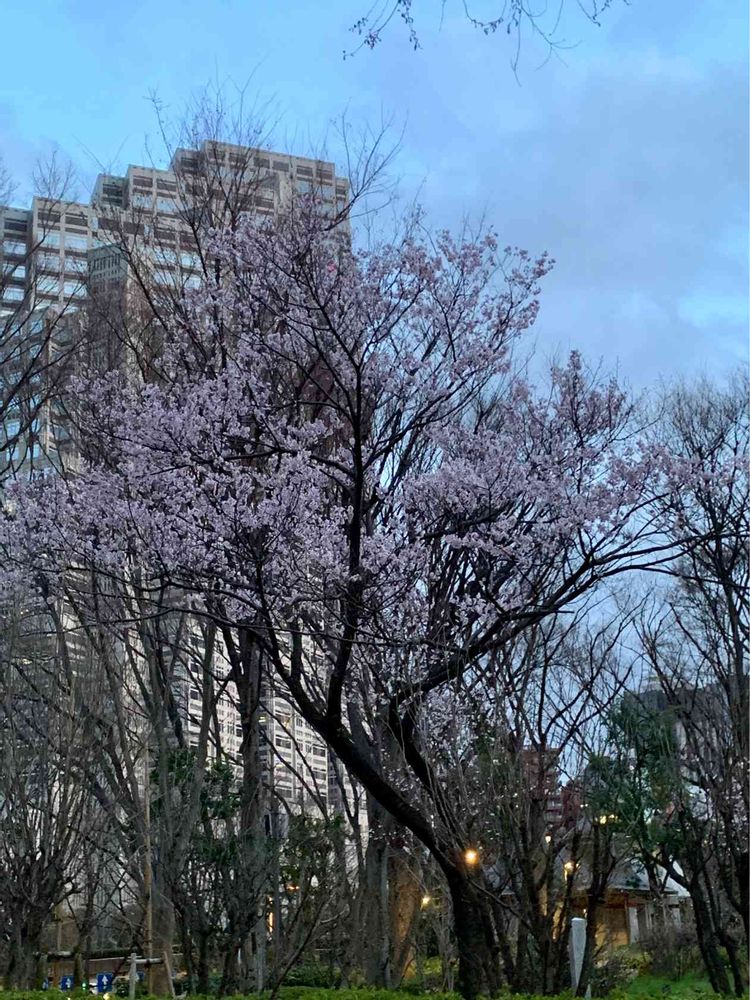 息子の転居先のマンションからの帰宅時に、最寄駅には向かわず新宿駅へ向かう途中の新宿中央公園で🌸