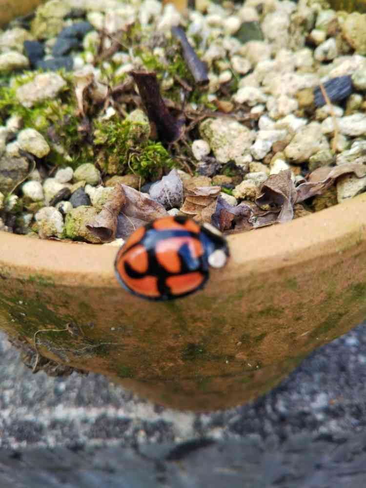 昨日は、囲いから鉢だししてましたら、てんとう虫の大きなやつ1㎝を無理やり起床、移動させてしまいました。動くのに数分 寝起きが悪い👴俺そっくり動作です。 ちゃう違う👨いや〰️😃機敏に動きポトリと石の中に寝床変更しました。