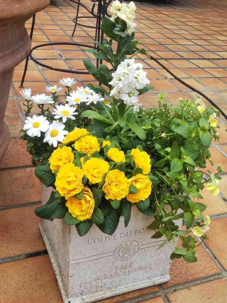 以前作った寄せ植えを新しくしました。右側のネメシアは以前のものですが、いい感じに垂れ下がっています(^^)