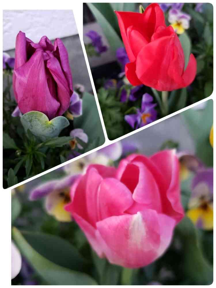 (ここに黄色のチューリップとピンクと紫のアネモネとさまざまな色のビオラが混植)