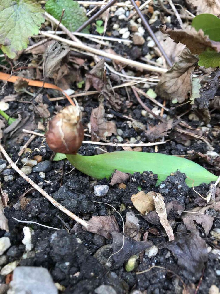 昨年鉢を整理して土を庭に空けていたのですがチューリップの球根が残っていたみたいです😅