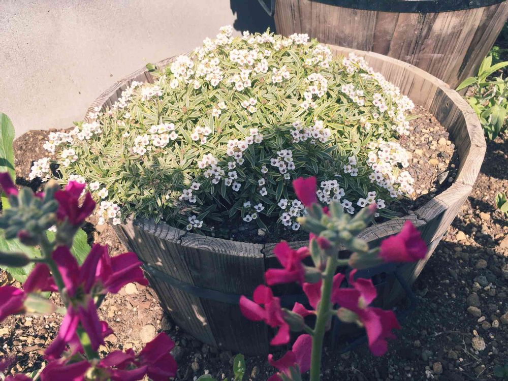 去年期待を込めて(ブワーッともりもりに咲くように)植えたスーパーアリッサム様。いまいち花の勢いがないような?なにが足りないのかなあ…肥料?!初心者の適当人間にはサッパリです😭