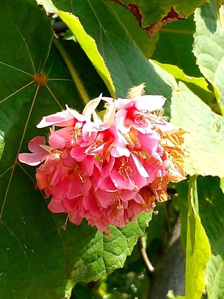 またまた見かけないお花見つけましたー!低木で大きな葉っぱ🌿こぶしほどの大きなお花ー!💗💗💗