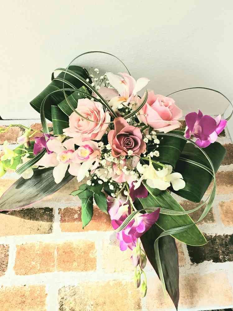 ハランとドラセナで作った🎀にデンファレを沿わせて。