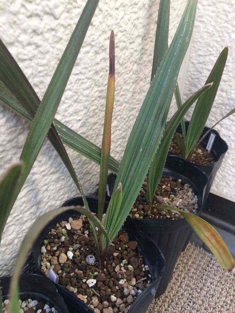 子供が近くを歩いて怪我するとヤバいので一番奥には葉縁に鋸葉があるリビストナ マリアエ達。