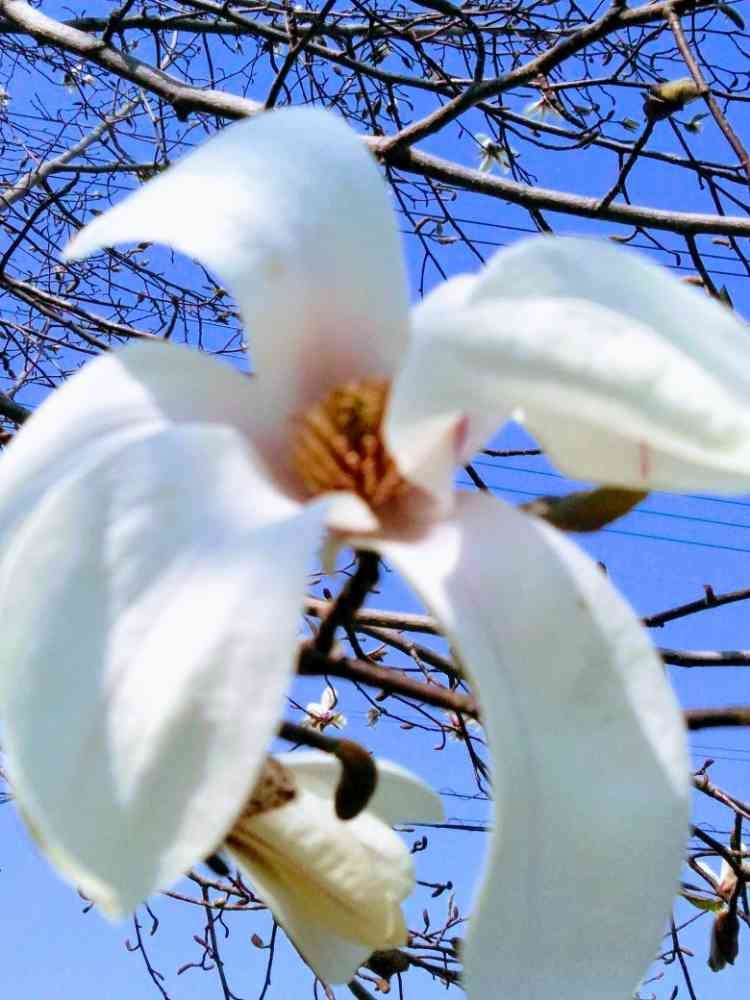 出勤途中で、水元公園の水辺の里の外の緑地に咲くこぶしと青い空が、綺麗でした。