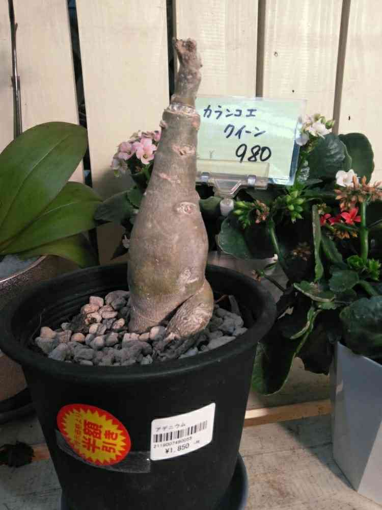 園芸店へ行ったら、まずお買得コーナーに行く、とおはなししましたが、この写真のアデニウム、皆さんなら買いますか?かいませんか?元値は1850円。半額なので、925円。そこそこお値段のするアデニウムとしては、価格面では確かにお買得。でも、品種不明、先は萎んでないものの、動き出す気配も『?』花が咲くタイプかどうかも不明。咲くタイプだとしても、どんな花が咲くかわからない・・・。去年アデニウムオベスムを2つ買った私。
