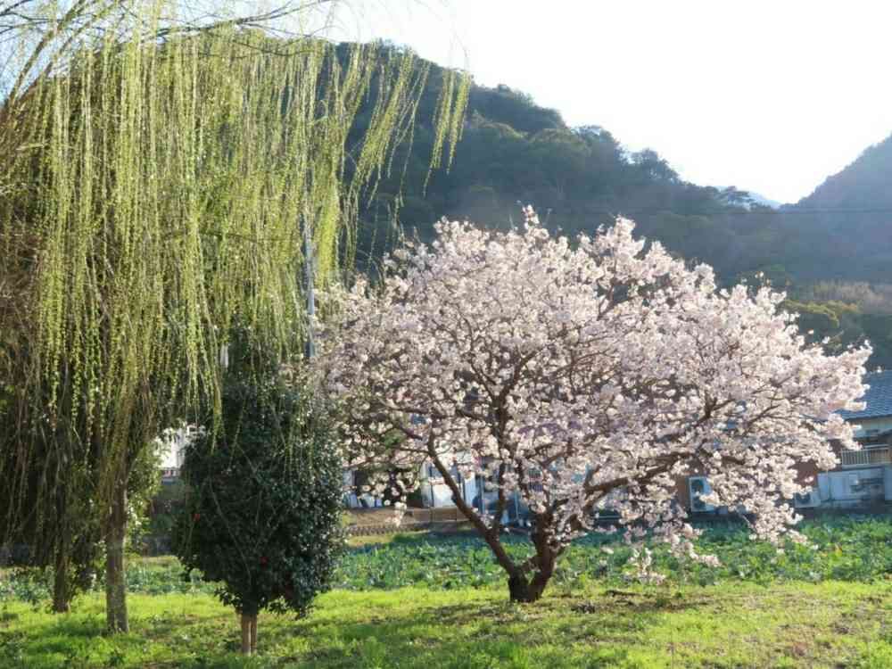 75番札所善通寺境内前の畑、枝垂れ柳と涅槃桜が朝日を浴びてキラキラと綺麗でした。