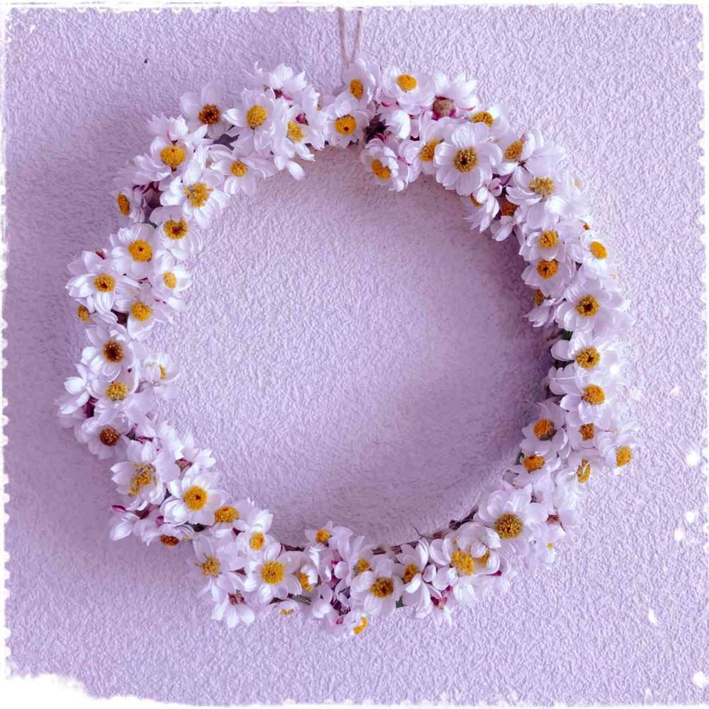 お花がシンプルて素朴な感じだから、何かコラボさせようと思ったんですが、ドライにしてたカーネーションの黄色がボロボロ落ちたので、花かんざしだけのシンプルリースになりました💛🤍💛🤍💛🤍