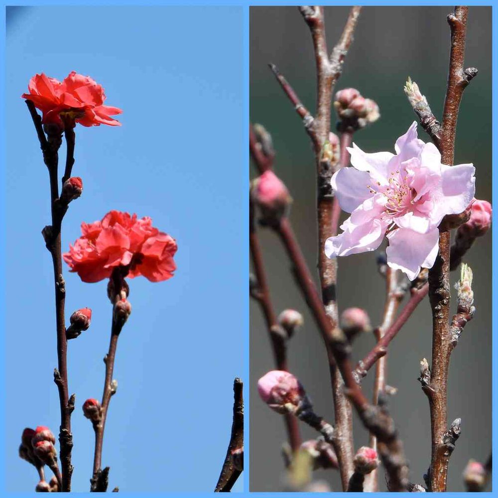 我が家の下の道端には桃や桜が数本並んでいます。庭から手が届くほどのところにちょうど花が咲くのです。何の世話もしないでこんな花が見られる、いいところだ😆