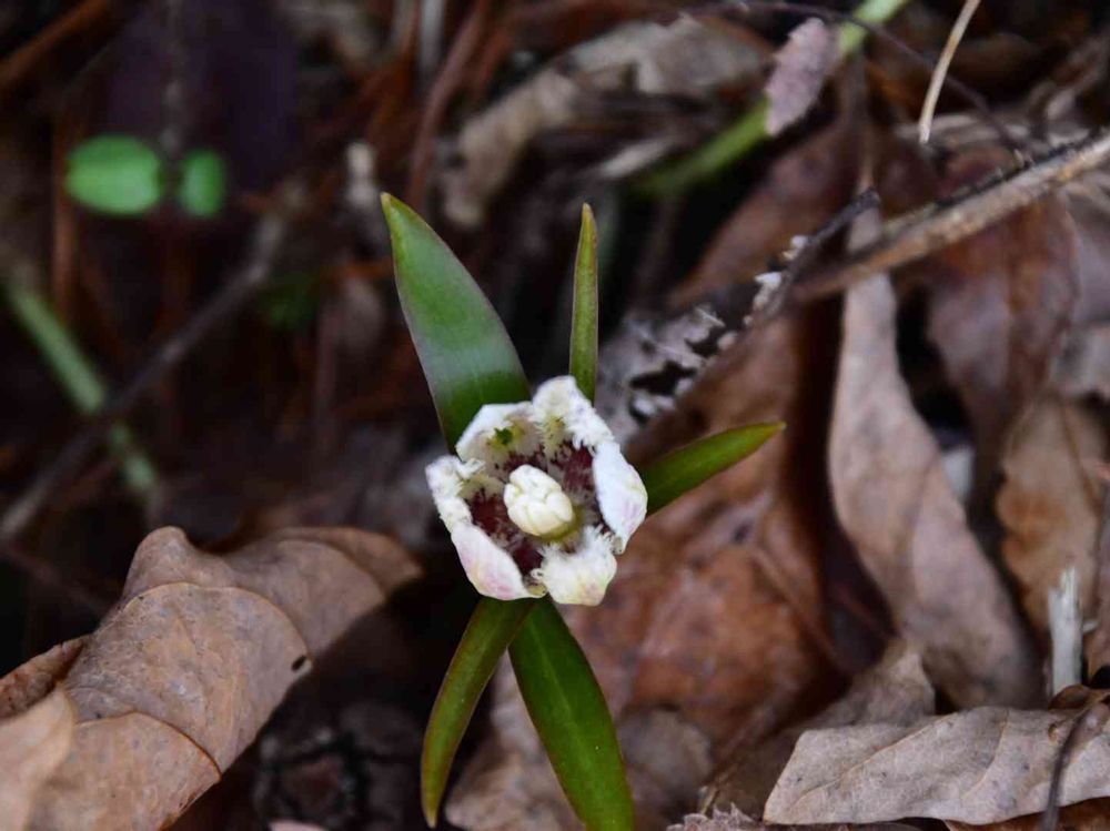 あらら、落ち葉に邪魔されて上を向いて咲いている😅