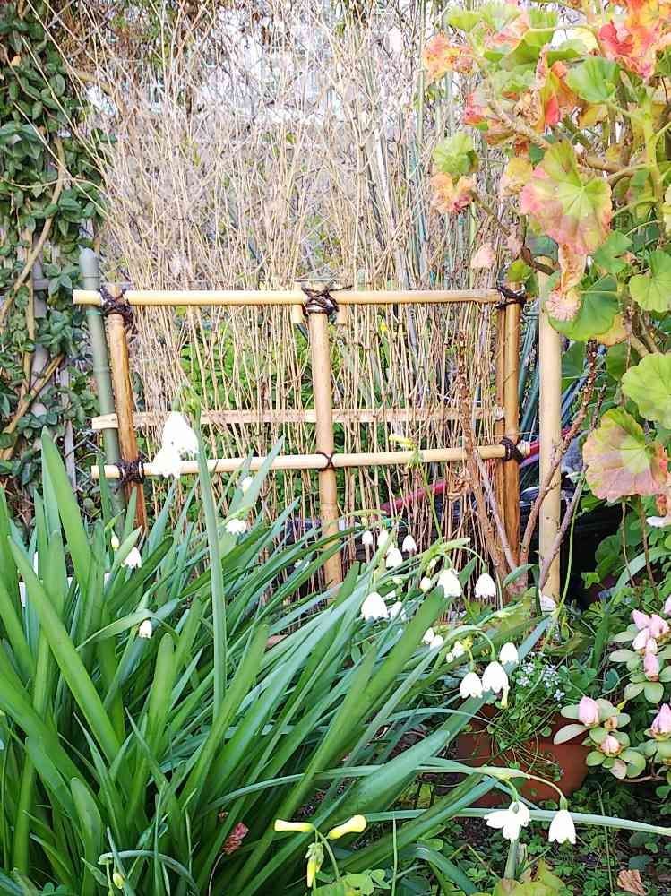 (竹垣用の結び方があるのですが、ちょっと素人には麻縄でしっかり結ぶのは無理でしたので…交差する所をドリルで穴を開け、アルミの針金で穴を通して適当に結び締め、更に見映えを良くするため麻縄でアルミの針金を隠すように結びました)