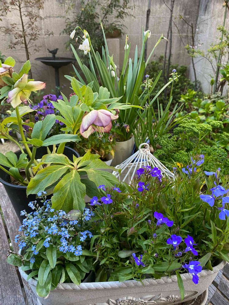 大好きな青い花たち。ロベリア、忘れな草。他にスノーフレーク(すずらん水仙)、クリローも。
