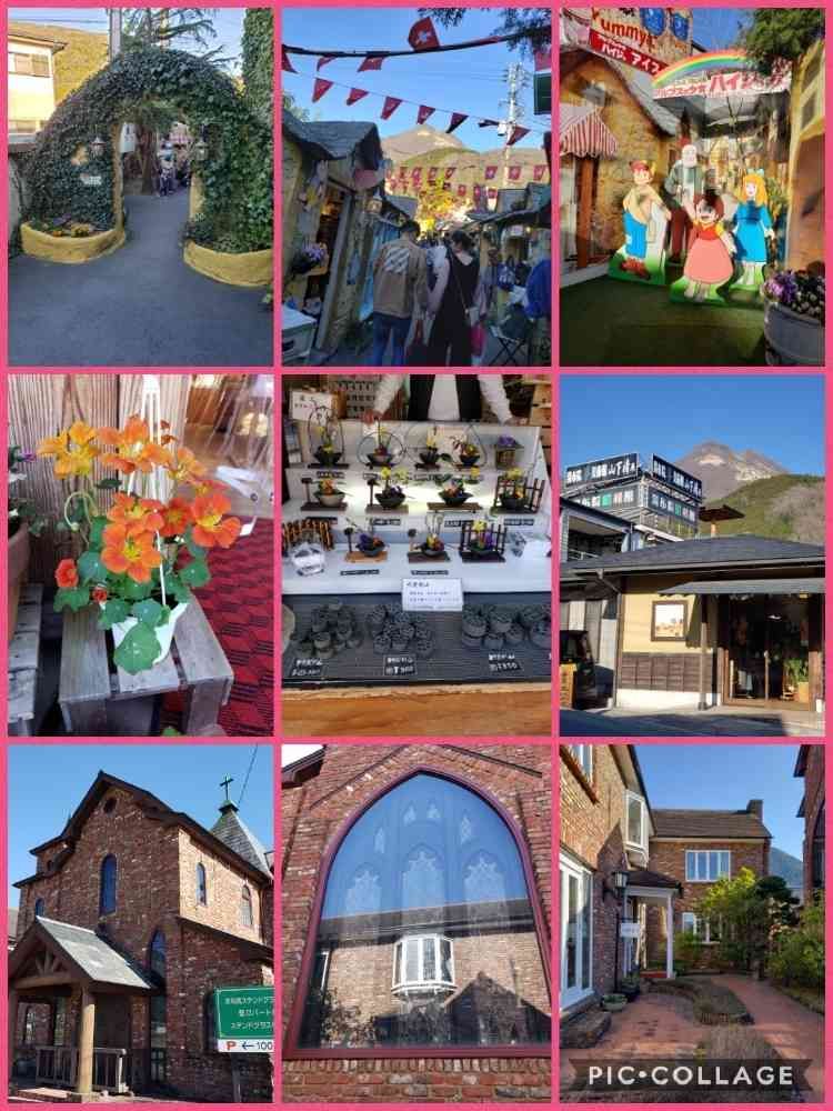 ハリー・ポッターの映画に出てくるようなお店街がありました。ピーターラビット、トトロ、ハイジ、フクロウなどのお店が並んでいました。その商店街の上方に由布岳が見えました。