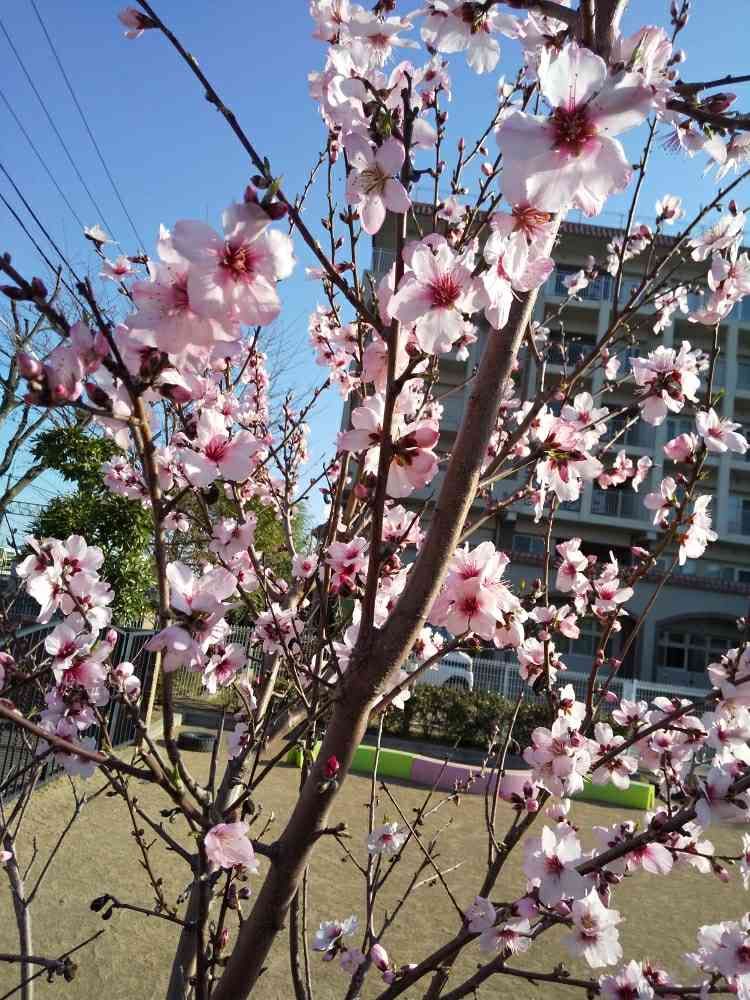 幼稚園の園庭に…キレイなアーモンドの花が咲いてます…